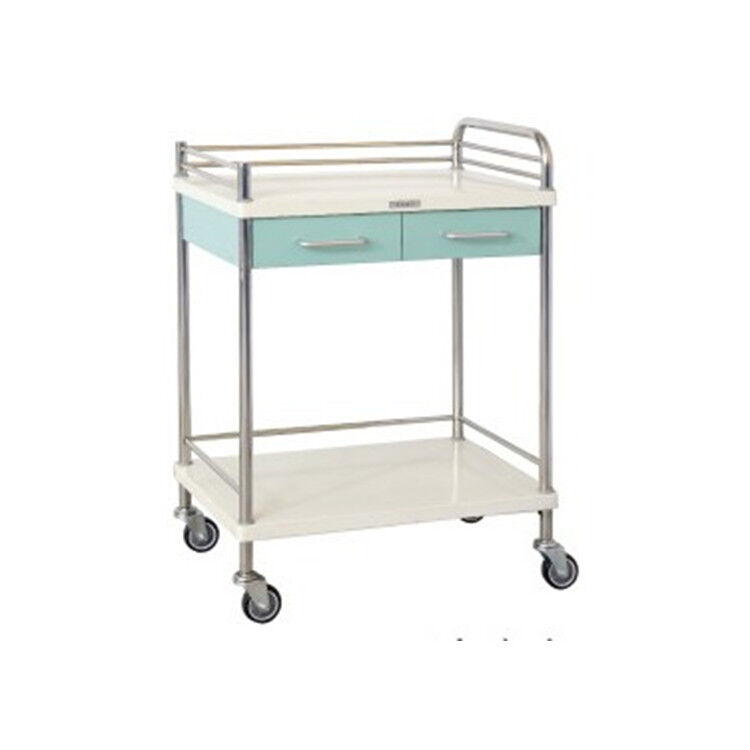 Ein hochwertiger klinischer Wagen aus Edelstahl, für Krankenhäuser und medizinische Einrichtungen konzipiert.und vier Räder mit Querbremsen für Stabilität und Mobilität.